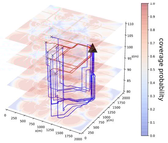 According to the aforementioned analysis, the anticipated interruption probability of UAV at any given location can be derived, enabling the construction of a 3D coverage probability graph (CPG). The constructed coverage probability map will be shown in Section 4, where coverage probability .