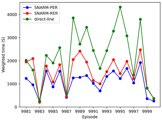 Figure 11 illustrates how the average return of the UAV flight path changes with the number of episodes across various algorithms. The average return of the path is calculated as the mean value of the returns from the previous 200 episodes, thereby introducing data smoothing and enhancing trend visibility through averaging within a moving window. The average mobile return serves as a pivotal index for assessing the overall efficacy of UAV movement processes. Incorporating the settings of return values as outlined in Section 3.4, a higher average movement return indicates lower cumulative flight and interruption times. A clear observation from Figure 11 is that, in the learning phase after 1000 episodes, UAVs leveraging the SNARM-PER algorithm, as proposed in this paper, exhibit notably superior average movement returns and enhanced motion performance compared to the contrasting algorithms. Figure 12 illustrates the total mission time of different algorithms during the last 20 episodes, representing a weighted sum of actual flight time and estimated interruption time. The weighted time of the last 20 episodes serves as an indicator of learning outcomes. As depicted in Figure 12, compared to SNARM-RER and direct-line approaches, the SNARM-PER algorithm excels in minimizing the weighted sum of UAV flight time and interruption time. Consequently, the UAV achieves a better balance between flight energy conservation and the avoidance of areas with weak communication coverage. All these findings serve to numerically validate the superiority of the proposed algorithm over other comparative methods. The UAV employing the SNARM-PER algorithm demonstrates enhanced capability in path planning under connectivity constraints while minimizing the weighted sum of flight time and interruption time.