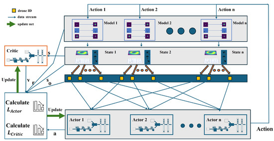 Marl usually refers to the algorithm that performs the best actions from the observation through the appropriate reward design. When multiple intelligent bodies have a common global reward, agents gradually adjust their actions to achieve collaboration in order to maximize the rewards. In the usual MARL algorithm, agents interact with the environment to learn good strategy, but in this problem, because the opponent’s strategy is unknown, agents do not interact directly with the environment but with the mathematical model mentioned above. With the MARL, at time step t, each agent i takes an action based on its observation and receives a single-step reward () from the model. During the interaction with the model, the agent leverages the reward information to update its policy in order to obtain a higher cumulative reward. The key components of the multi-agent reinforcement learning (MARL) system are as follows: