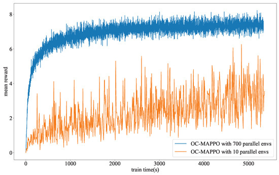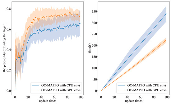 To validate the effectiveness of the established GPU parallel model, we conducted two comparison experiments. The first comparison was made between the OC-MAPPO method combined with the parallel GPU model and non-GPU parallelized model in a task scenario with a fixed target’s start position. In the first method, 3 × 256 GPU cores were utilized to update 768 mathematical models simultaneously, while the interaction rounds between MAPPO and the environment were reduced to one round. On the other hand, the second method involved CPU updates for 10 mathematical models with 40 interaction rounds. The second comparison was made between the OC-MAPPO method with 10 environments, which can be parallized in the CPU, and the OC-MAPPO method with a 3 × 256 environment, which needs to use a GPU because of the limited core of the CPU, in scenarios with various target’s start position. The purpose of the second experiment was to compare the effect of a GPU parallel environment in a more challenging scenario. Apart from the number of parallel environments, all other parameters remained consistent with the experiments conducted in the first part.