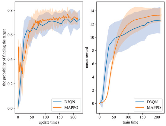 Figure 6, while the horizontal axis has been altered to represent the training time required by both methods because of their distinct updating mechanisms. As evident from the graph, the MAPPO approach begins to surpass the D3QN method at approximately 50 s and maintains a consistent advantage thereafter. In the right panel, the horizontal axis represents training time, and the