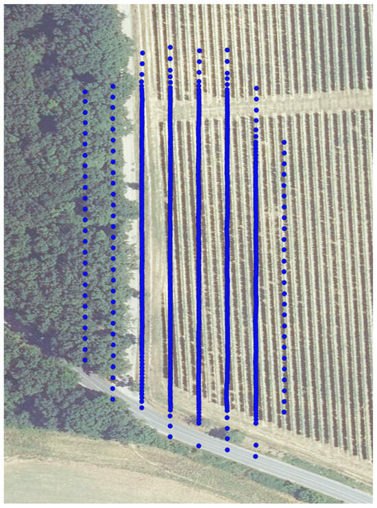 The study area included five vine rows in Topoľčianky (48°25′40.14″ N, 18°23′51.48″ E, WGS84) (Slovakia) (Figure 1). This vineyard was planted in 2015 (Vitis vinifera cv Riesling Italico). Rows were approximately the same length, 121 m on average. Vines were spaced 3 m between rows and 0.8 m within a row, with the height of the vine approximately 2 m. The vineyard was located on the plain, and the surveyed area was 0.2 ha. A total of 5 rows were studied.