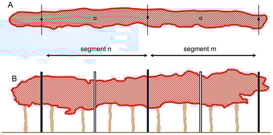 Figure 4. Schematic representation of segments and the area representing the thickness (A) and side section (B). On average, each segment included 12 trunks in reality. Segments were formed by every second pole (black).