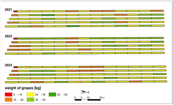 The graphical representation of the grape harvest is shown in Figure 5. Several zones alternated between higher and lower yields on a biannual base. The total production output for the year 2021 equaled 1688 kg, followed by 1620 kg in 2022 and 1625 kg in 2023. The quantity of grapes harvested from individual segments varied, ranging from 6.4 kg to 48.4 kg in 2021, 6.9 kg to 39.3 kg in 2022, and 3.3 kg to 38.2 kg in 2023.