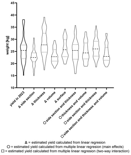 The distribution of individual yield prediction compared to harvested yield is graphically visualized in Figure 6. The closest distribution of predicted data and mean to harvested yield is when equation E (Table 4) was applied, using parameters such as side section and thickness. The mean of predicted yield was comparable to harvested yield, 25.1 ± 4.6 kg and 25.7 ± 5.3 kg, respectively.