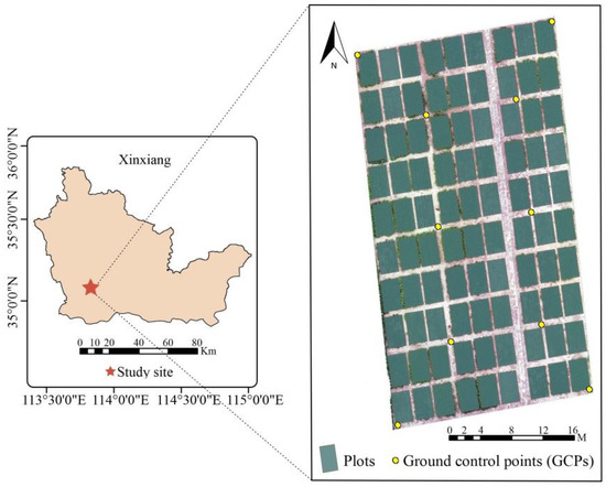 In this study, peas were sowed on 15 October 2019 and data were collected in 2020. The research was conducted at the experimental base of the Chinese Academy of Agricultural Sciences in Xinxiang, Henan province (113°45′38″ E, 35°8′10″ N). The annual average temperature and humidity of Xinxiang are 14 °C and 68%, respectively. The annual average rainfall is 656.3 mm. The period from June to September is the wettest, with an average precipitation of 409.7 mm. The test site had 90 plots with dimensions of 8 m2 (4 × 2 m; length × width), and 30 pea varieties (16 cold-tolerant varieties and 14 common varieties) were planted with three replicates (Figure 1).