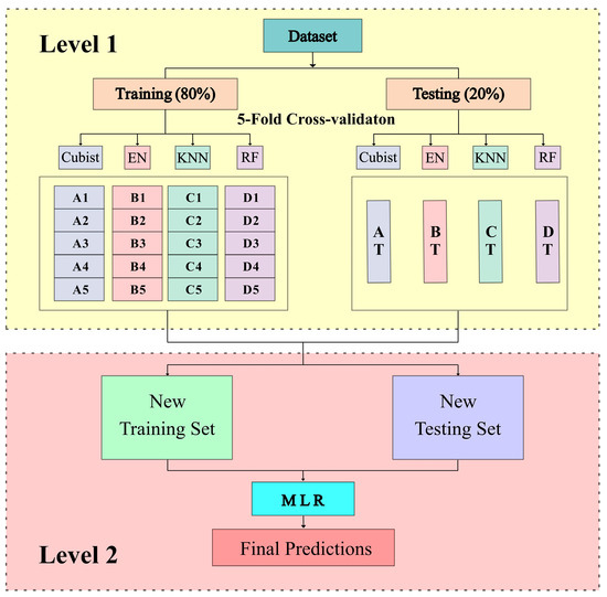 The stacking ensemble learning was first proposed by Wolpert [45]. It is typically a heterogeneous ensemble method that involves training multiple individual learners of different types in parallel. These learners are then combined using a meta-model to generate a final estimation result. As shown in Figure 3, EL consists of two levels. The first layer consists of Cubist, EN, KNN, and RF, where the initial training set is inputted to each base learner using 5-fold cross-validation. In the second level, it consists of combining the estimation results of the base learners into a new matrix, using MLR as the secondary learner, leveraging the predictive abilities of multiple base learners for training, and obtaining the final result.