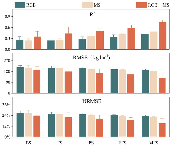 Comparison of estimation accuracy using different sensors. MS: multi−spectral; RGB + MS: fusion data of RGB and MS; BS: branching stage; FS: flowering stage; PS: podding stage; EFS: early filling stage; MFS: mid filling stage.