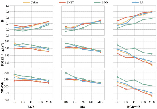 The features extracted from two types of sensors (RGB and MS) and their combination (RGB + MS) were regarded as different datasets for estimating pea yield using Cubist, EN, KNN, and RF models (Table S3). The estimation performances of the single and dual sensors were compared to determine the optimal sensor condition, as indicated by the highest obtained R2 value.