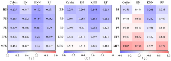 Variation in estimation accuracy (R2) in the different growth stages using the different algorithms. (a): RGB; (b): MS; (c): fusion data of RGB and MS; BS: branching stage; FS: flowering stage; PS: podding stage; EFS: early filling stage; MFS: mid filling stage; EN: elastic net; KNN: K nearest neighbor; RF: random forest.