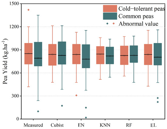There was no significant difference in the ability of the machine learning algorithms on estimating two types of peas (cold-tolerant and common) in this study. The common peas achieved a higher estimation yield than cold-tolerant peas, which is consistent with the measured pea yield. Previous studies have shown that, although different crop varieties exhibit different phenotypic characteristics, UAV-based high-throughput plant phenotypes were accurate and repeatable for yield estimation [52]. This result, obtained in the present work, is consistent with those previous findings.