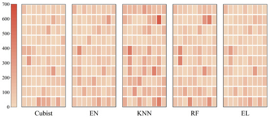 Pictorial diagram of the estimation errors, indicating the absolute differential values between the estimated and measured values. Units = kg·ha−1; EN: elastic net; KNN: K nearest neighbor; RF: random forest; EL: ensemble learning.