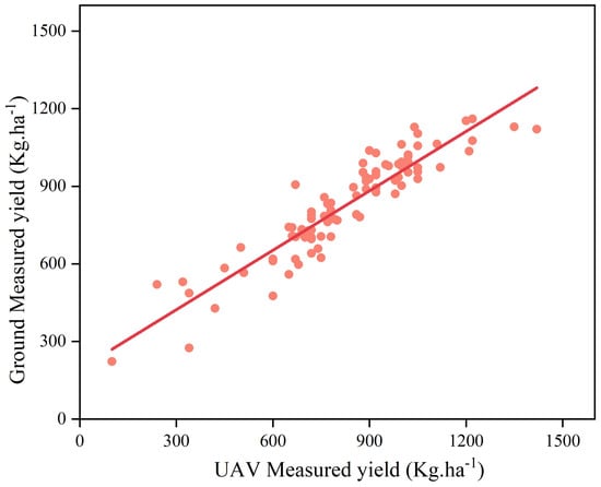 Scatter plot of ground-measured and best−estimated yield.