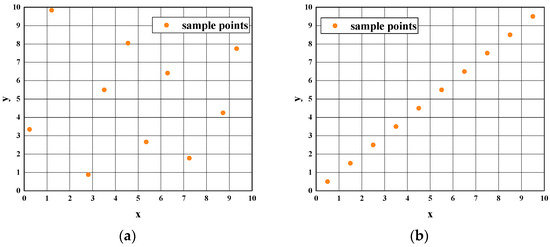Comparison of LHS and OLHS results in a two-dimensional space with ten sample points. (a) Sampling results of OLHS method. (b) Poor distribution of LHS.