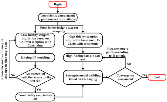 This paper uses the operational states of high-altitude propellers as the design space. Altitude, wind speed, and rotational speed are considered independent variables, while thrust and torque generated by the propeller are treated as dependent variables for constructing a surrogate model. Low-fidelity sample data is obtained using the blade element momentum theory (BEMT), while high-fidelity sample data is acquired through the CFD method. A Co-Kriging model is then developed by combining both high- and low-fidelity sample data. The surrogate model adds high-fidelity sample data according to the EI criterion until the model accuracy meets the requirements or reaches the maximum number of enhancements. The flowchart for this method is as follows, along with detailed steps: