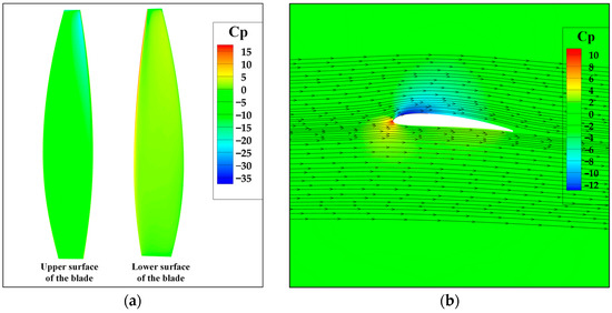 High-altitude propellers experience a wide range of aerodynamic conditions due to the large altitude range and the significant variation in speeds of solar-powered UAVs. In Figure 5, at the design point condition, the pressure difference occurs between the upper and lower surfaces of the propeller. This pressure difference results in positive thrust and is accompanied by stable flow. However, when the rotational speed is low and the wind speed is high, the propeller assumes a windmill state and the pressure coefficient on the upper surface of the propeller is significantly higher than the pressure coefficient on the lower surface. This pressure difference leads to the generation of negative thrust. In this state, the propeller experiences an upward shift in the stagnation point, accompanied by flow separation. Therefore, it is necessary to avoid this condition during propeller operation.