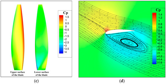 Analysis of propeller aerodynamic performance. (a) Pressure coefficient distribution map on the blade surface under the design point conditions. (b) Airfoil streamline diagram of blade section at 75% radius under the design point conditions. (c) Pressure coefficient distribution map on the blade surface under windmill state. (d) Airfoil streamline diagram of blade section at 75% radius windmill state.