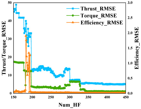 In this section, a surrogate model for the aerodynamic performance of high-altitude propellers is constructed using 900 low-fidelity sample data and 150 high-fidelity sample data. Subsequently, additional high-fidelity sample points are incrementally added based on the EI criterion. The surrogate model for high-altitude propellers is divided into three components: the thrust surrogate model (TSM), the torque surrogate model (QSM), and the efficiency surrogate model (ESM). The efficiency surrogate model is obtained through calculations involving thrust and torque. First, the model’s accuracy is assessed based on the RMSE values of the surrogate model. The following figure shows the RMSE values of the surrogate model on the test set after each addition of high-fidelity samples. The horizontal axis represents the number of newly added high-fidelity sample points, while the left vertical axis represents the RMSE values of thrust and torque, and the right vertical axis represents the RMSE values of efficiency.