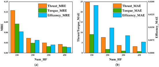 In order to further validate the accuracy of the surrogate model, surrogate models are selected with 150, 250, 350, and 450 high-fidelity samples. Subsequently, the MRE and MAE values are verified on the test set for each of these surrogate models. Figure 8 displays the MRE and MAE values of the surrogate models constructed with varying numbers of high-fidelity sample points.