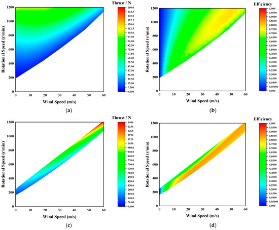 Propeller aerodynamic performance at 0 km and 25 km. (a) 25 km-thrust. (b) 25 km-efficiency. (c) 0 km-thrust. (d) 0 km-efficiency.
