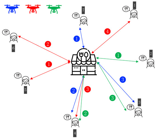 Figure 1 illustrates the problem context of this study. The numbers within the gray rectangle are the customer numbers, and the numbers within the circles indicate the delivery sequence for each drone. The blue drone loads food from the restaurant and visits Customer 7 first. After completing the delivery to Customer 7 and returning to the restaurant, it loads food again and visits Customer 4, followed by Customer 3. Customers 1, 2, 5, 6, and 7 order a small amount of food, so one drone makes only one delivery. On the other hand, Customers 3 and 4 order a large amount of food that cannot be delivered by a single drone. Therefore, 2 drones make a delivery for Customer 3, and 3 drones for Customer 4. For example, for Customer 4, the blue and green drones each make a second delivery, while the red drone makes a third delivery, resulting in a total of three separate deliveries for Customer 4. Of course, the same drone can also make 2 deliveries in sequence.