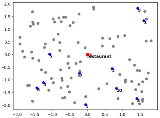 For the numerical experiments, there are total of 100 customers, with food demand for delivery occurring for 10 of them at a specific time. The locations of the restaurant and customers are shown in Figure 2. The blue circles represent customers with demand, and the numbers indicate the customer IDs. The gray circles mean customers with no demand. The food delivery demand per customer is as shown in Table 1.