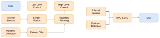 During each time step, the RL agent is supplied with a sequence of observations that is composed of the drone’s current state and position relative to the moving platform. The observations are contained in a vector , where d, v, , and q represent the drone’s 3D distance to the moving platform, 3D linear velocity, 3D angular velocity, and 4D quaternion, respectively.