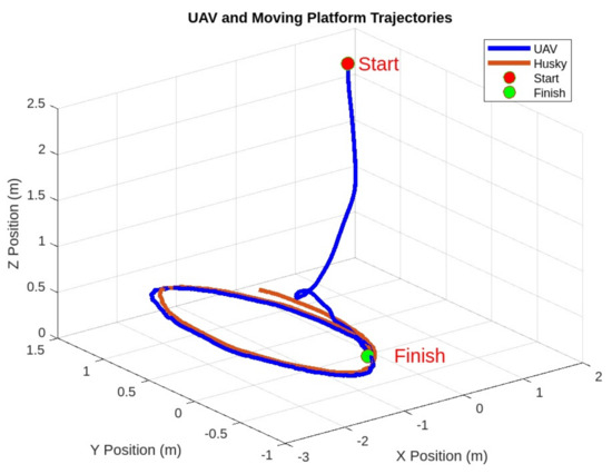 Figure 6. During testing, the UGV was set on random trajectories that were not encountered during the training phase. The episode would reset if the UAV strayed beyond an eight-meter threshold from the moving platform or if it made contact with the ground. Of importance, no interactive communication or coordinated behavior occurred between the Husky and the UAV during landing.