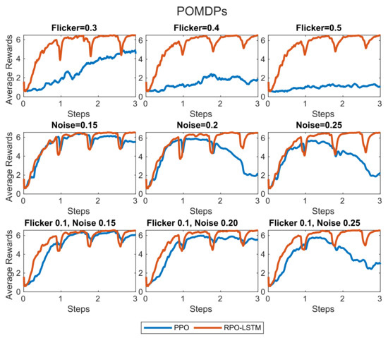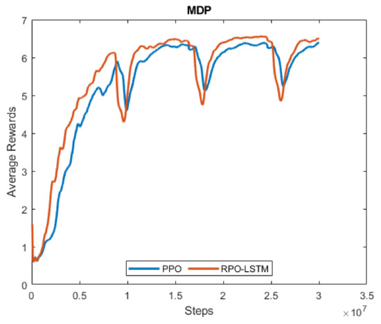 Figure 7. In the MDP environment, the training performance of the RPO-LSTM algorithm is comparable to that of the state-of-the-art PPO. After training, the agents were retrained with various partial observabilities, with each POMDP trained for 500 iterations. The simulation was run on a desktop PC with an Intel i7-11700K CPU, NVIDIA RTX 3060, and 64 GB of RAM.