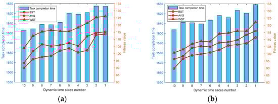 To verify the effect of the number of dynamic time slices on the effectiveness of the task assignment scheme and the flight condition, this experiment chooses to change the number of dynamic time slices and performs the simulation verification based on the eight abovementioned types of task loads. Figure 9a–h shows the three fitness values and task completion times for 10 random runs of the 4DI-GWO algorithm with different numbers of time slices and different task loads.