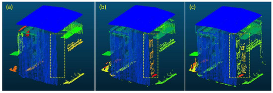 As can be seen from the rectangular box in Figure 2a, the initial region growth did not completely segment the wall. But the initial plane fusion method will aggregate some plane point clouds of the wall together, and the area of the segmented wall plane is greater than the initial region growth, as shown in the rectangular box of Figure 2b. After the multilevel fusion of planes, almost the entire wall point cloud was successfully grown out, as shown in the rectangular box of Figure 2c.