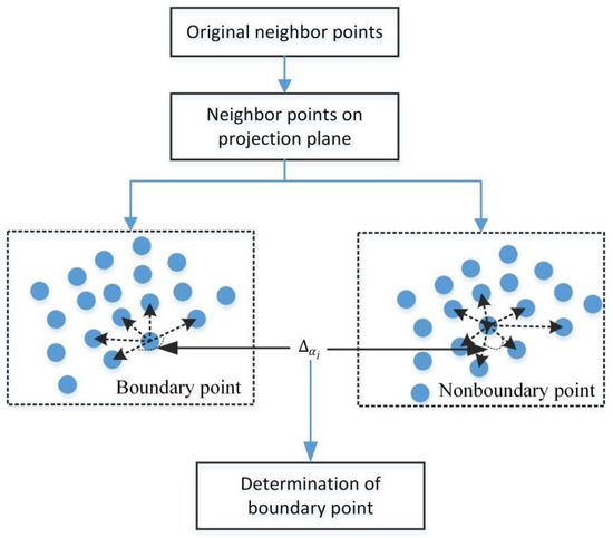 For the segmented planes, the geometric feature distribution of adjacent points is used to extract boundary points, as shown in Figure 3.