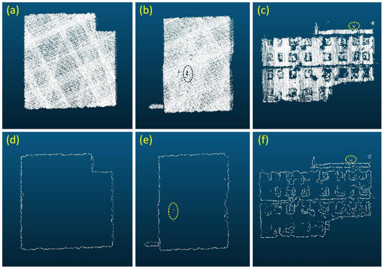 From Figure 4, it is visible that the boundary points of each segmented planes of the UAV building point cloud are extracted. Figure 4a,b shows the roof plane, from which it can be seen that the density of points is relatively high. Therefore, the extracted boundary points have a good effect, as shown in Figure 4d,e. For the second roof, the extracted boundary points contain redundant points, as shown in the oval box of Figure 4e. The reason for this phenomenon is that a few points are absent in the second roof and there is a void, as shown in the oval box of Figure 4b. Although the point cloud on the wall of the UAV building is messier and sparser than the point cloud on the top surface, the proposed method can still extract the wall contour, especially the profile of the window, as shown in Figure 4f. However, the extracted wall boundary points still contain redundant points, as shown in the oval box of Figure 4f. The reason for this is that there are messy and redundant points in the UAV wall point cloud, as shown in the oval box of Figure 4c.