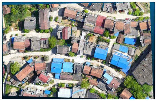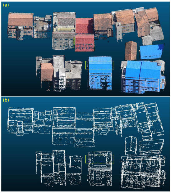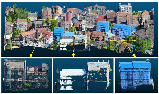 Since the UAV collects the point cloud data from the top, the point clouds of buildings in a horizontal direction are complete, especially the roofs. However, the wall points of the building are very sparse, and sometimes they are even all missing, as shown in Figure 6.
