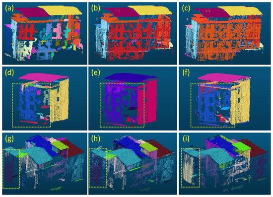 Segmentation results of three UAV buildings point clouds, (a,d,g) are segmentation results of region growth method; (b,e,h) are segmentation results of single-level fusion of regional growth plane segmentation; (c,f,i) are segmentation results of multilevel fusion of regional growth plane segmentation.