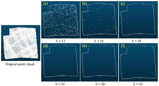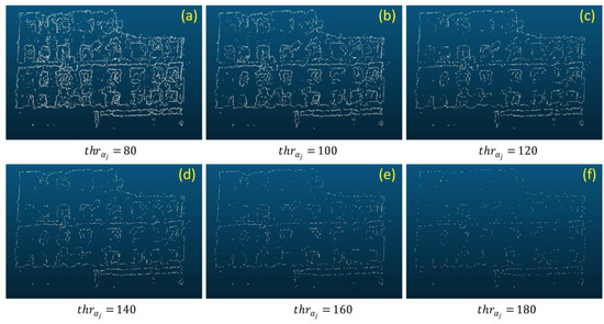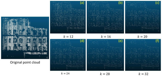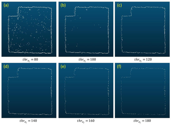 In the same case, when the value of is small, more redundancy points are retained, as shown in Figure 13a. When the value of is increasing, the number of redundant points will decrease, and the boundary points will be lost. For example, preserves significantly more boundary points than , as shown in the comparison of Figure 13b,c. Moreover, when the value of is very large, a large number of boundary points cannot be preserved, as shown in Figure 13f. From the above analysis, the value of should be around 120.