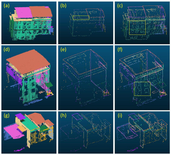 The different colors in Figure 14a,d,g represent different segmented plane point cloud of different buildings. By the same token, the different colors in Figure 14b,c,e,h,i represent different boundary points. For the first building, the contours of the roof extracted by the method appear to be broken, as shown in the rectangle box of Figure 14b. As can be seen from Figure 14c, the proposed method preserves the roof contour points well. In addition, the method failed to preserve the outline of the window on the wall, as shown in Figure 14b,e,h. The reason for this phenomenon is that the wall point cloud is very sparse, and the method is easily affected by the point cloud density. However, the contours extracted by the proposed method include the window contours, as shown in the rectangle box of Figure 14c,f. This illustrates that the proposed method is also suitable for point clouds with sparse density. From Figure 14, it is clearly visible that the method in this paper preserves more complete contour points than the method.
