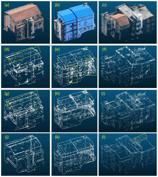 Comparison of contour points extraction by different methods, (a–c) Three building point clouds, (d–f) Region clustering curvature method [32], (g–i) Global constraint approach [28], (j–l) Proposed method.