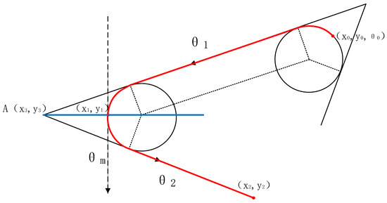 Figure 2 presents a schematic diagram of the optimal path. The red trajectory represents the Dubins optimal path, which passes through the initial point, midpoint, and terminal point. is the heading angle (relative to the X-axis) of the initial point . and are the angles of the line where they are located (relative to the X-axis). represents the heading angle of the midpoint . Ma et al. reached the conclusion that a line drawn from the midpoint to the point of intersection A of the two line segments bisects the angle of intersection, which is shown by the blue line segment in Figure 2. On the optimal path, and . Substituting these values into Equation (8) allows the system of simultaneous equations to be solved. The results can then be utilized in Equation (9).