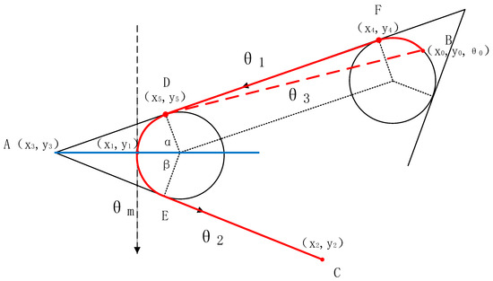 Next, let us consider the scenario where the distances between the initial, intermediate, and terminal waypoints are relatively close. Figure 3 depicts the path planning between the initial, intermediate, and terminal waypoints, where the solid red lines represent Dubins trajectories. However, when the distances between the initial and intermediate points are close, the error between the angle (relative to the X-axis) of the line segment connecting point F () and point D () and the angle (relative to the X-axis) of the line segment connecting the initial point B () and the tangent point D () (red dashed line segment) cannot be neglected. Therefore, we cannot directly substitute the coordinates of the initial point B () into Equation (12) to solve for the direction angle (relative to the X-axis) of the intermediate point. In this scenario, the heading angles of the initial and terminal points will affect the values of and .