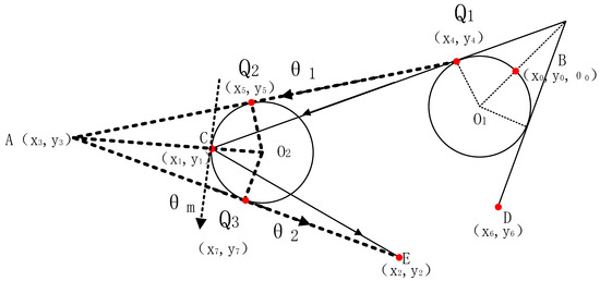 In the scenario where the initial point () is close to the midpoint, the heading angle at the initial point will affect the heading angle at the midpoint. In this paper, we introduce an adjacent point () to the initial point (). We preprocess the target point () using the optimization algorithm for the scenario where the initial point is far from the midpoint, as described in Figure 3, to obtain a tangent point Q1 (). Then, we use this tangent point Q1 () instead of the initial point () as the new target point. We repeat the previous step for the midpoint (). This process allows us to obtain a compensated heading angle for the midpoint. As shown in Figure 4, represents the angle of the line segment connecting tangent points Q1 () and Q2 (), and represents the angle of the line segment connecting tangent point Q3 () and the terminal point C. O1 and O2 are the centers of the two circular trajectories. The solid black line represents the process of solving for the substitute point Q1, and the dashed black line represents the process of using the substitute point Q1 instead of the initial point B to solve for the direction angle of the midpoint.