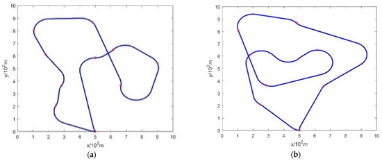 From Figure 3, it can be observed that when the waypoints are close to each other, the actual can significantly differ from the original . In such cases, continuing to use for calculations would lead to significant errors. It is challenging to obtain a solution for the fully coupled trigonometric equations. To address this issue, we propose a four-point optimization algorithm for calculating the heading angles, aiming to minimize the deviation caused by error terms.