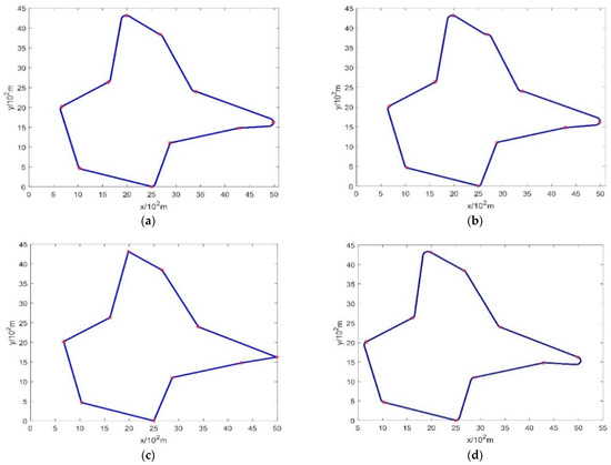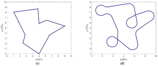 Sussmann and his colleagues, in their seminal paper in 1991, established the existence of a solution to the Dubins path problem, wherein the optimal trajectories manifest as either CαCβCδ or CαSdCβ, where 0 ≤ α, δ < 2π, π < β < 2π, and d ≥ 0 [26]. Given the inherent non-uniqueness of solutions to the Dubins path, generally, multiple trajectories can converge to the minimal value [27]. As discerned from Equation (7), the shortest path of the Dubins curve is intricately linked to the heading angle. The choice of distinct heading angles results in divergent selections within the path details. Consequently, determining the heading angles in the Dubins curve emerges as a pivotal factor in ascertaining the unmanned aerial vehicle’s shortest path [28]. In Section 2.2, we introduce a heading angle model that exhibits a notable enhancement when compared to existing algorithms. The specific data comparisons are presented in Section 4.