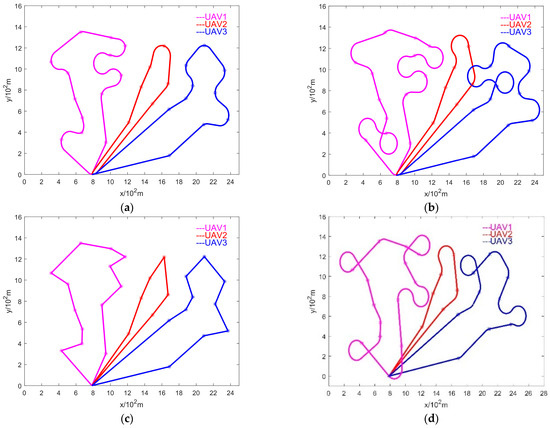 Figure 8 describes the trajectory planning for multiple unmanned aerial vehicles (UAVs) and various target points employing distinct algorithms for takeoff from the same points. The straight-line trajectory based on the ETSP algorithm serves as the reference standard under ideal conditions. From the illustration, it is evident that the compensatory look-ahead algorithm adeptly accomplishes the planning of paths for multiple UAVs and multiple targets. Notably, the total mileage of path planning for multiple UAVs and multiple targets using different algorithms is shown in Table 4. The compensatory look-ahead algorithm demonstrates an improvement of no less than 8.4% in the context of the multi-tasking, multi-UAV path-planning model.