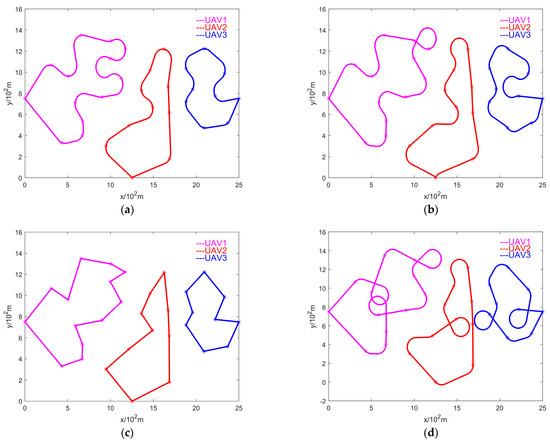Trajectory maps for drone formation planning using different algorithms for takeoff from the same points: (a) compensation look-ahead algorithm; (b) 2-opt look-ahead algorithm; (c) ETSP; (d) alternating algorithm.