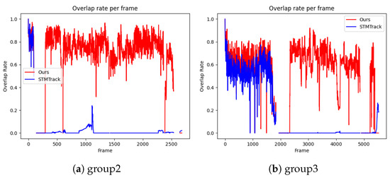The TS metric is employed to assess the quality of the tracked region for each frame. If the TS of the current region exceeds a predefined threshold (0.6), it will be incorporated into the feature memory as a new template, following the processes of cropping and feature extraction. Specifically, the new template will perform the following operations to yield the optimal template features: (1) obtain the cropping size of the current image according to Equation (23), and then crop with the target as the center point; (2) resize the cropped region to to obtain a template containing the foreground region and the background region; (3) generate a foreground–background mask map with the same size as the foreground and the background in the template; and (4) the cropped template and the mask map are jointly fed into the feature extraction network to obtain the template features (the purpose is to improve the tracker’s discrimination between the target and the background), and finally the template features are stored in the feature memory.