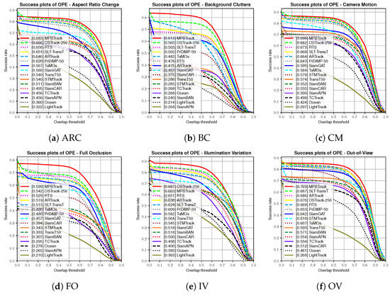 Figure 11 and Figure 12 show the success and precision plots for attribute evaluation, respectively. The proposed method achieves excellent performance in both attribute evaluations. In terms of success, the scores are ARC (0.683), BC (0.613), CM (0.698), FO (0.599), IV (0.663), OV (0.703), PO (0.689), SV (0.706), and VC (0.742); in terms of precision, the scores are ARC (0.881), BC (0.870), CM (0.900), FO (0.857), IV (0.856), OV (0.898), PO (0.894), SV (0.900), and VC (0.906). The attribute evaluations demonstrate the remarkable performance of the proposed DTUN and BPM in dealing with various complex situations, proving the effectiveness of our approach.