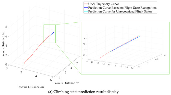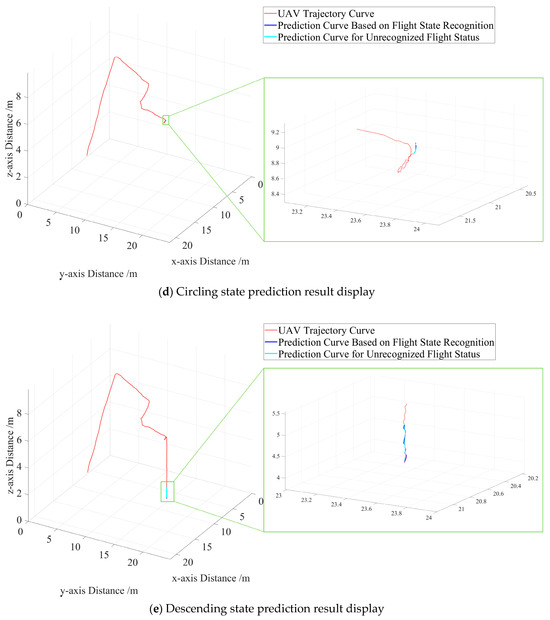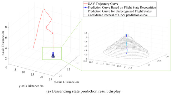 Upon preprocessing the gathered UAV flight data and identifying flight states, predictions are made for climbing, level flight, turning, spiraling, and descending states, respectively. The predicted and corrected flight trajectory prediction models are determined by the multivariate Adams model. The UAV’s confidence curves predicted by the model and after flight state recognition are shown, respectively, in Figure 7.