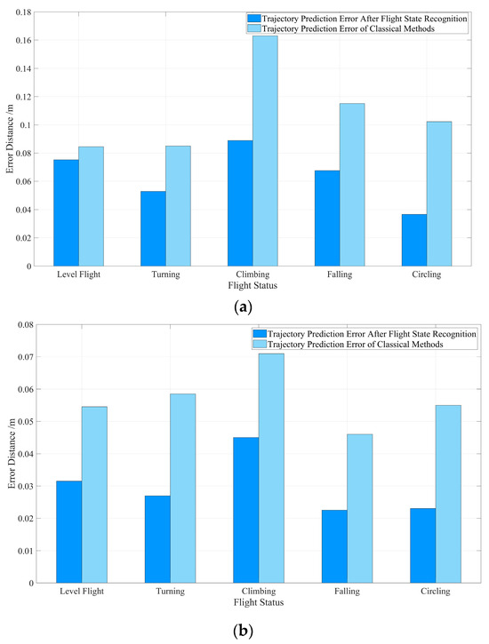 The predicted UAV trajectory distance errors before and after flight state recognition for the two prediction models are calculated separately, as depicted in Figure 8.