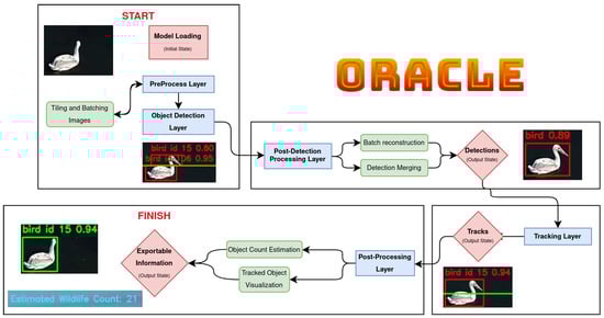 ORACLE is a five-layered model capable of applying advanced object detection and tracking techniques, along with the extraction of valuable information and analytics from drone footage. It is capable of extracting data, such as estimating counts of wildlife, exporting videos using various visualization methods, adding masks to distinguish an object from the background, and more. ORACLE uses state-of-the-art computer vision models prioritizing small- to medium-sized objects. Figure 4 illustrates the sequential processes executed by our model to facilitate the extraction and exportation of significant analytics.